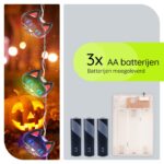 Geen gedoe met ingewikkelde installaties! Dit Halloween lichtsnoer wordt geleverd met 3 AA-batterijen, zodat je het direct kunt gebruiken. Hang het op, schakel het in, en geniet van de kleurrijke gloed die je Halloween decoratie compleet maakt.