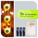 Het Halloween Lichtsnoer Oogballen is eenvoudig in gebruik. Plaats de meegeleverde 3 AA batterijen in de batterijhouder en schakel de lampjes in. De 40 LED lampjes verspreiden een warm wit licht dat perfect is voor het creëren van een sfeervolle Halloween ambiance. De snoerlengte van 6 meter biedt voldoende flexibiliteit om je creativiteit de vrije loop te laten.
