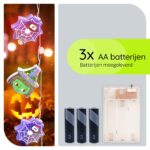 Het lichtsnoer werkt op 3 AA batterijen, die al zijn inbegrepen, zodat je direct kunt beginnen met decoreren. Schakel het in met de eenvoudige aan/uit-schakelaar en geniet van de kleurrijke LED-verlichting die je huis in een Halloween paradijs verandert.