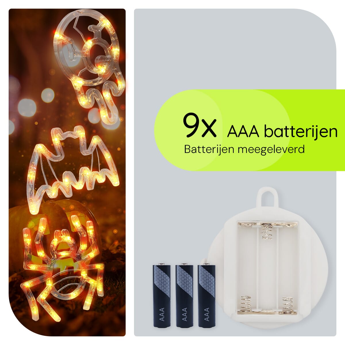 De Halloween Verlichting Raam Set werkt op AAA batterijen, die bij de set zijn inbegrepen. Plaats eenvoudig de batterijen in de decoraties, bevestig ze met de zuignappen aan het raam, en schakel de sfeerverlichting in voor een spookachtig effect.