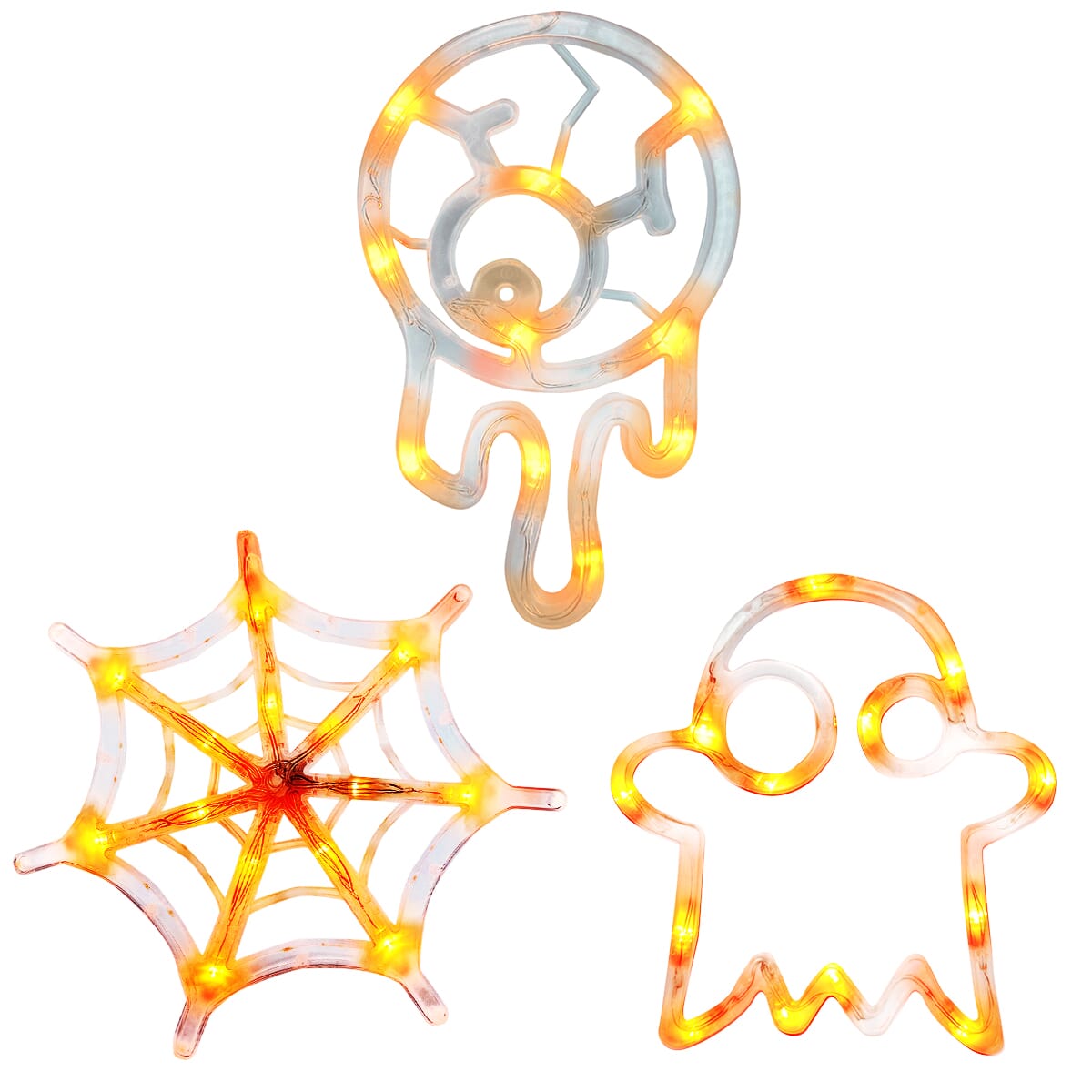 Met deze Halloween Verlichting Raam Set creëer je in een handomdraai een spookachtige sfeer. De set bestaat uit drie verschillende ontwerpen: een spinnenweb, een spook en een oogbal. Deze diversiteit zorgt ervoor dat je ramen opvallen en bezoekers meteen in de Halloween-stemming komen.