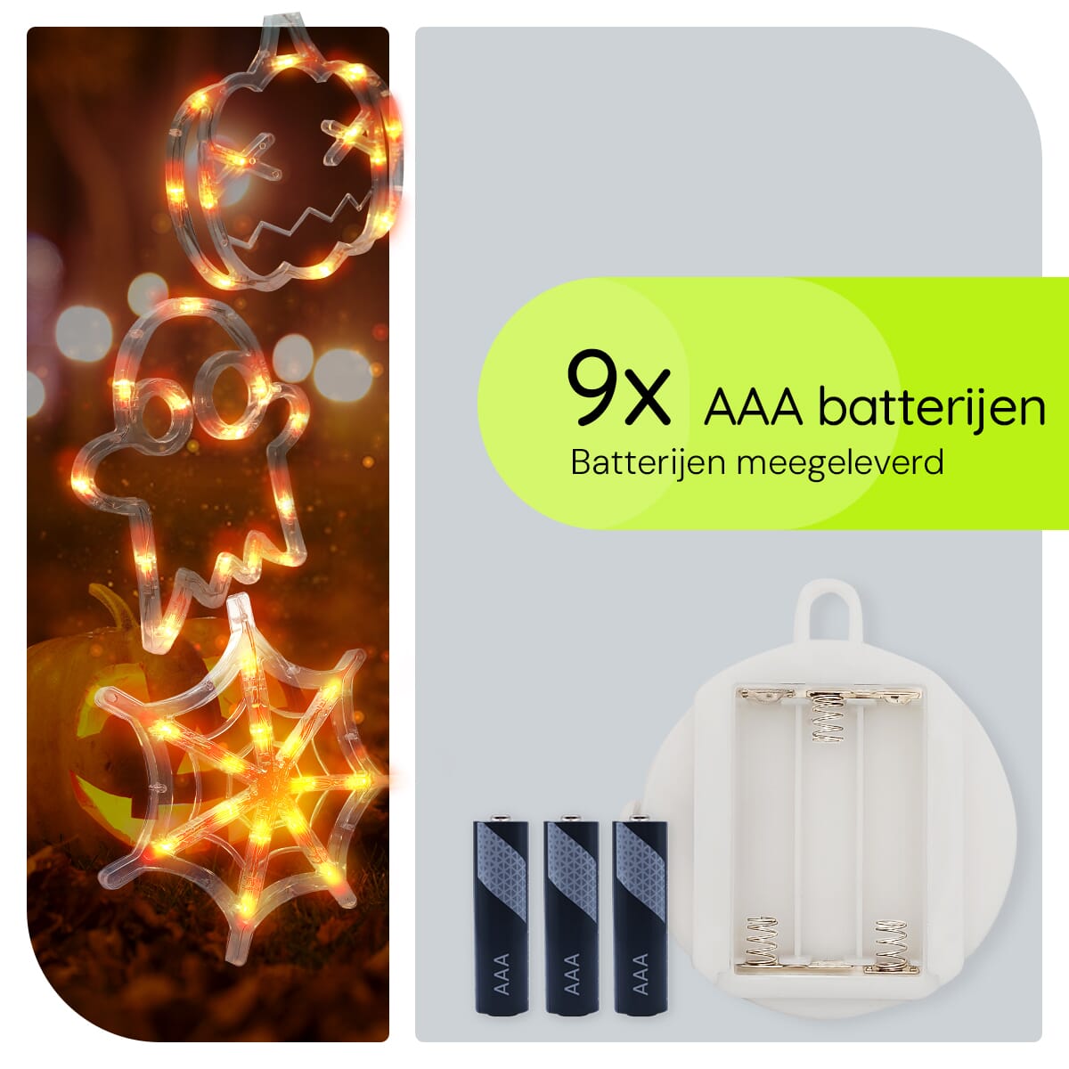 Deze feestverlichting wordt geleverd met 3×3 AAA-batterijen, zodat je direct aan de slag kunt. De batterijen zorgen ervoor dat je geen last hebt van vervelende snoeren en dat de verlichting lang meegaat, zelfs tijdens de langste Halloween-nacht.