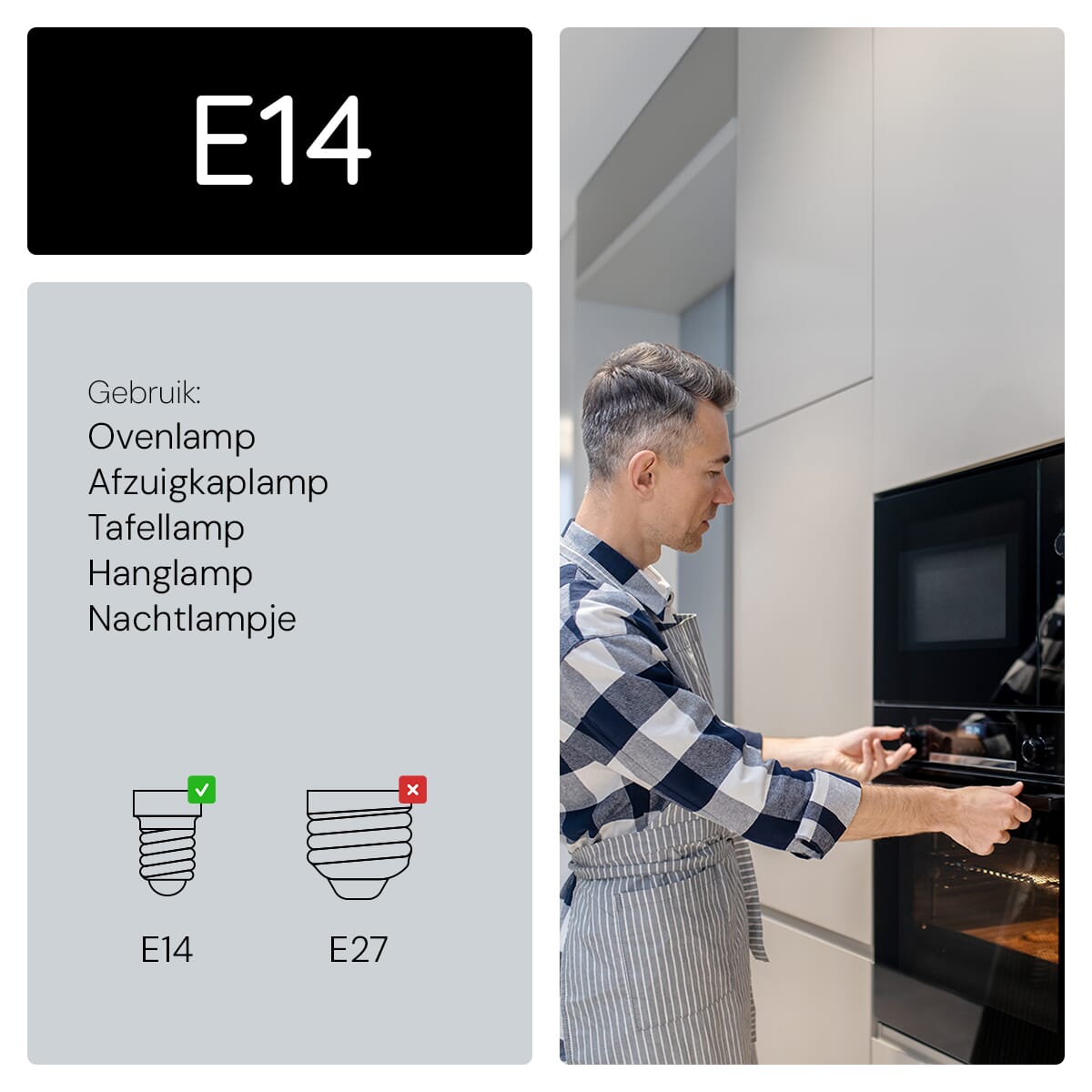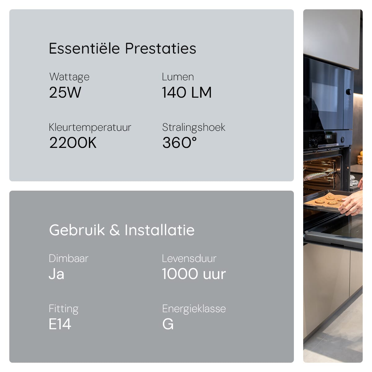 Dankzij de E14 fitting is de installatie van de Asalite Ovenlamp eenvoudig en snel, zonder dat er speciaal gereedschap nodig is.