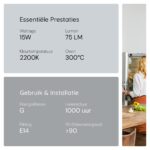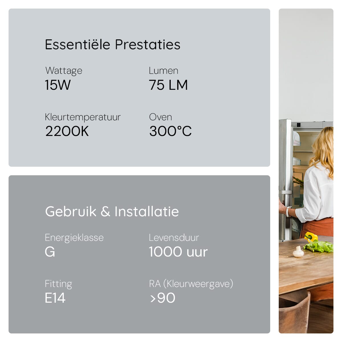 Met een lichtopbrengst van 75 lumen en een kleurtemperatuur van 2200K, biedt de lamp een helder en warm wit licht. Dit zorgt voor een aangename verlichting die de inhoud van uw koelkast of oven goed zichtbaar maakt.
