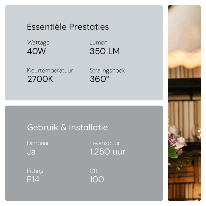 - Kleurtemperatuur: 2700K (Extra Warm Wit)