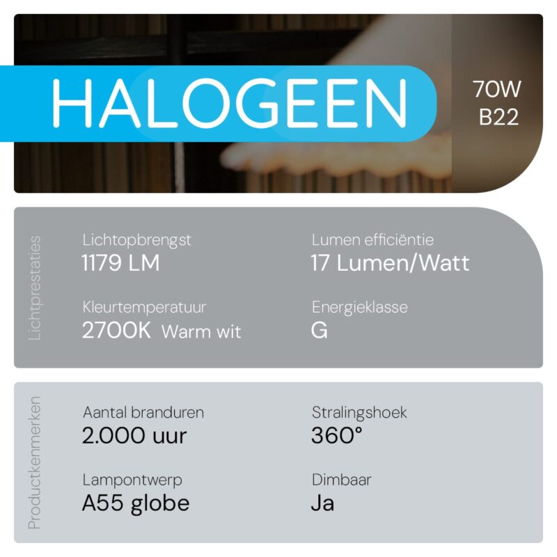 Modee B22 Halogeen Lamp Dimbaar 70W ECO – 1179lm – 2700K – Warm Wit – ECO Halogeen Globe A55 – 3 stuks