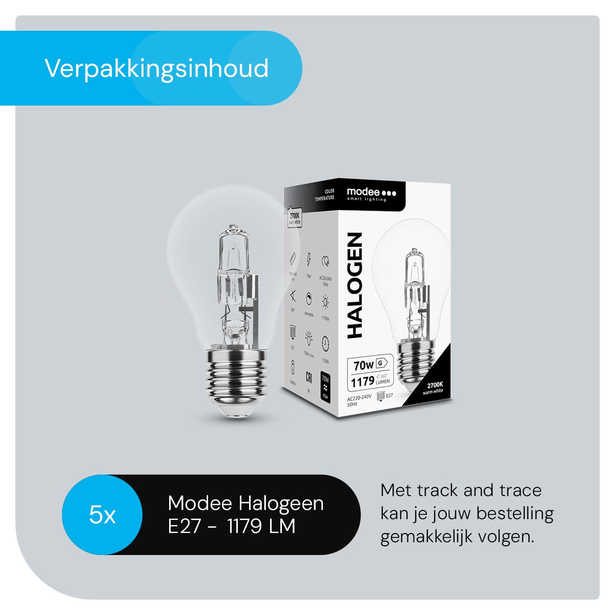 Modee E27 Halogeen Lamp Dimbaar 70W ECO – 1179lm – 2700K – Warm Wit – ECO Halogeen Globe A55 – 5 stuks