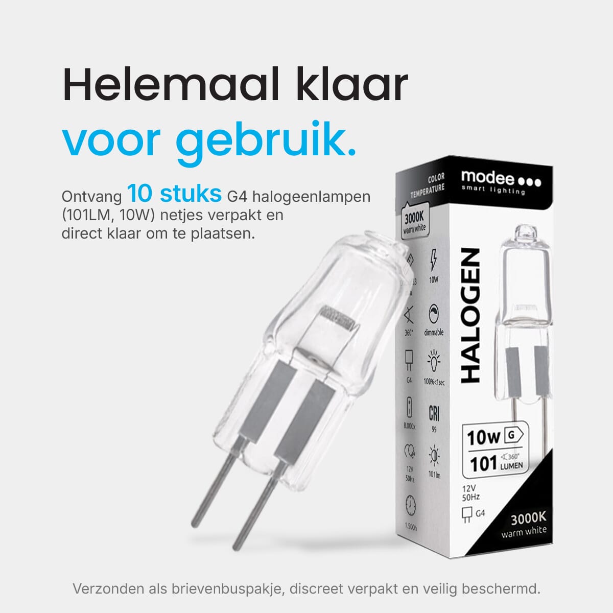 De Modee G4 Halogeen 10W 12V lampjes zijn ontworpen voor gebruik in diverse verlichtingsarmaturen die een G4 fitting vereisen. Deze halogeenlampjes bieden een warm wit licht van 3000K en zijn ideaal voor zowel residentiële als commerciële toepassingen. Met een lichtopbrengst van 101 lumen per lampje zorgen ze voor een aangename en sfeervolle verlichting.