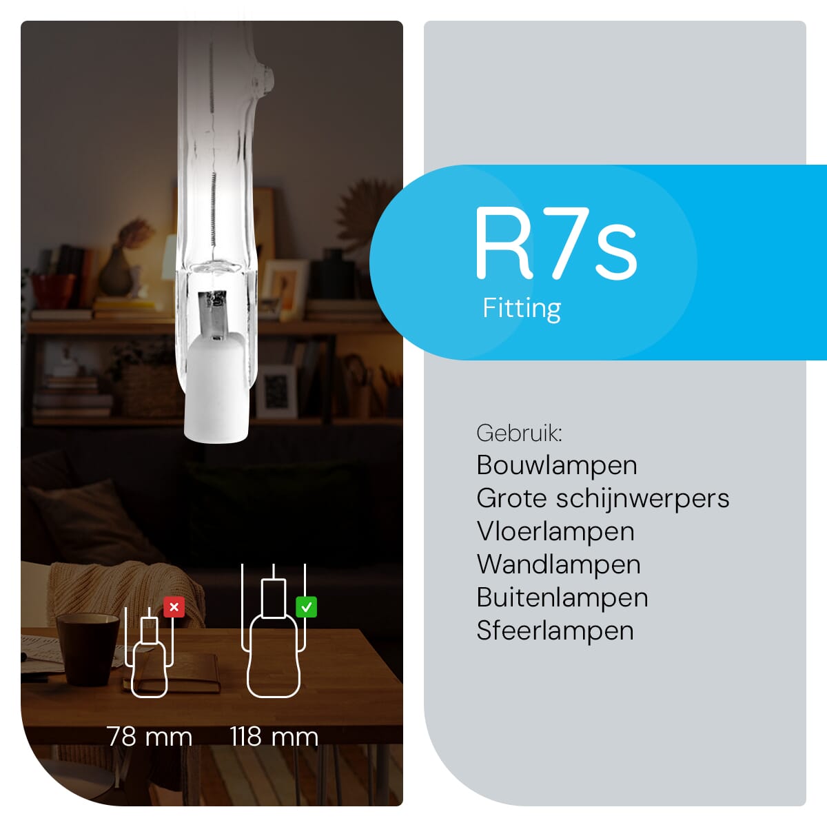 De Modee Halogeenlamp R7s werkt op een standaard 230V stroomvoorziening en is eenvoudig te installeren in armaturen die geschikt zijn voor R7s lampen. Met een lengte van 118mm past deze staaflamp perfect in diverse verlichtingsarmaturen. De lamp biedt direct helder licht zonder opwarmtijd, waardoor je meteen kunt genieten van optimale verlichting.