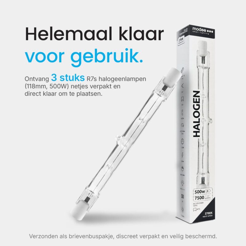De Modee R7s halogeenlamp is een krachtige staaflamp die ontworpen is voor gebruik in diverse verlichtingsarmaturen. Met een lengte van 118mm en een vermogen van 500W, biedt deze lamp een helderheid van 7500 lumen. De lamp straalt warm wit licht uit en is dimbaar, waardoor het geschikt is voor zowel functionele als sfeerverlichting. Deze set bevat drie halogeenlampen, ideaal voor grotere ruimtes of meerdere armaturen.