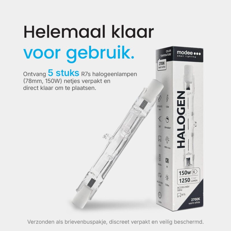 De Modee R7s halogeenlamp is een staaflamp die ontworpen is voor gebruik in diverse verlichtingsarmaturen. Met een lengte van 78mm en een vermogen van 150W, biedt deze lamp een helderheid van 1250 lumen. De lamp straalt warm wit licht uit en is dimbaar, waardoor het geschikt is voor zowel functionele als sfeerverlichting. Deze set bevat vijf halogeenlampen, ideaal voor het vervangen van meerdere lampen tegelijk.