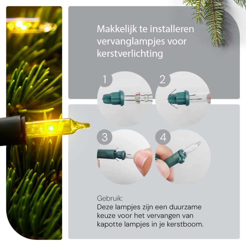 Breng de magie van Kerstmis weer tot leven met deze handige reserve kerstlampjes! In plaats van de hele set te vervangen, kun je met deze insteeklampjes eenvoudig de kapotte exemplaren in je kerstboomverlichting vervangen. Een kleine verandering met een groot effect: je boom straalt weer als nooit tevoren.