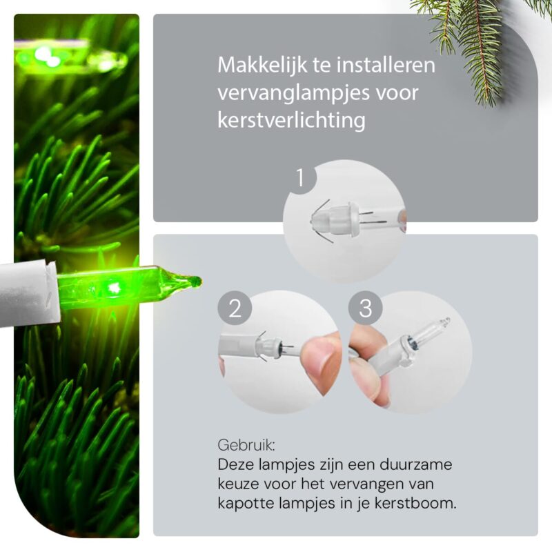 Met deze reserve kerstlampjes hoef je je geen zorgen te maken over ingewikkelde installatieprocessen. Het vervangen van lampjes is snel en eenvoudig: haal het kapotte lampje eruit en plaats het nieuwe insteeklampje in de fitting. Zo kun je binnen enkele minuten weer genieten van een stralende kerstboom.