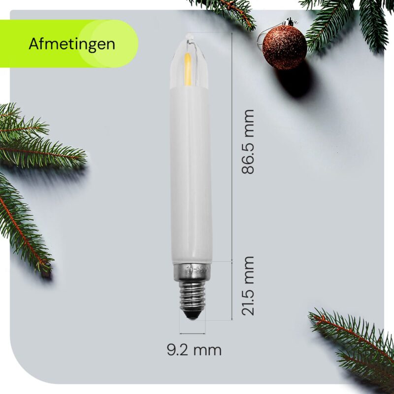 Verlicht de feestdagen zonder gedoe! Met onze reserve kerstlampjes hoef je niet langer een compleet nieuw lichtsnoer of kerstdecoratie aan te schaffen wanneer een lampje het begeeft. Vervang eenvoudig het defecte lampje en geniet direct weer van een stralende kerstboomverlichting. Deze reserve LED lamp E10 biedt een duurzame en kostenefficiënte oplossing voor al je kerstverlichting behoeften.