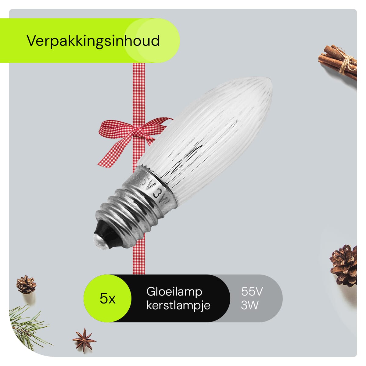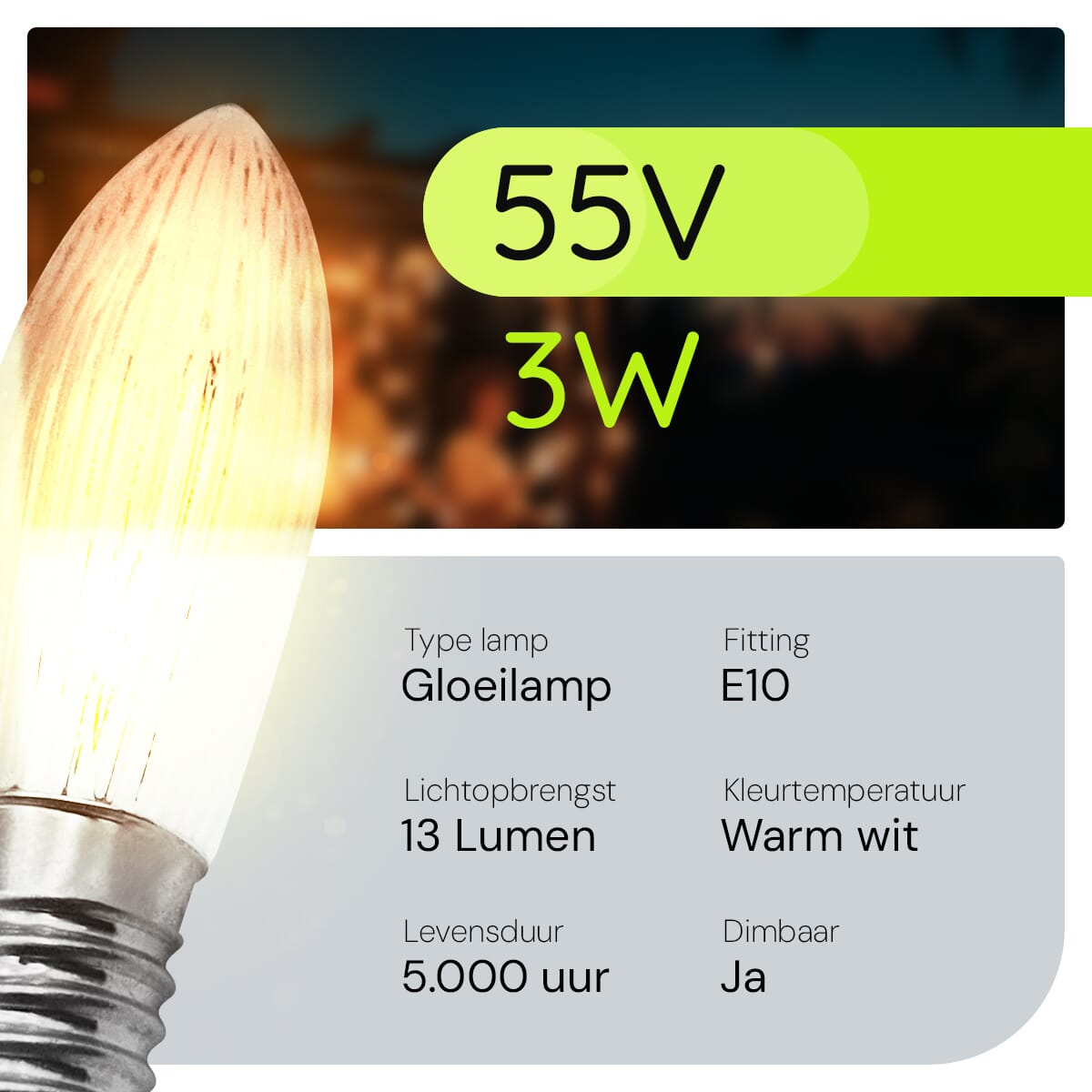 Deze reserve lampjes werken eenvoudig door ze in de E10 fitting van je huidige kerstverlichting te draaien. Met een spanning van 55V en een vermogen van 3W zorgen ze voor een helder warm wit licht van 2200K en 13 lumen. Perfect voor het verlichten van je kerstboom of andere decoraties.