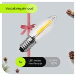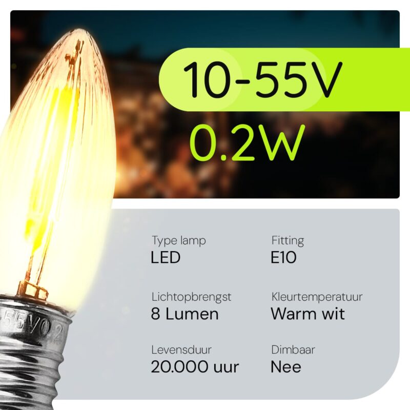 Deze reserve LED lamp E10 is ontworpen om eenvoudig in je bestaande kerstverlichting te passen. Schroef het kapotte lampje eruit en vervang het door een nieuw E10 LED filament lampje. Het niet-dimbare ontwerp zorgt voor een constante lichtsterkte, ongeacht de spanning.