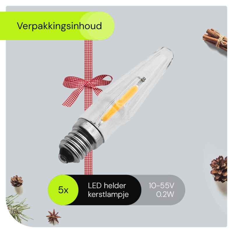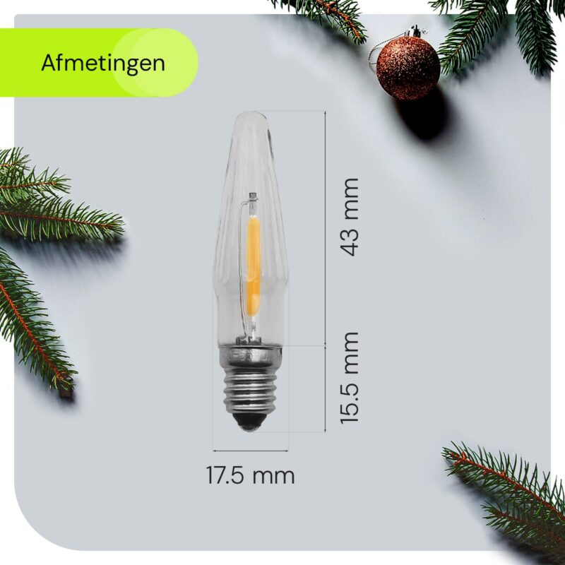 Deze reserve LED lamp E10 is ontworpen om eenvoudig in je bestaande kerstverlichting te passen. Schroef het kapotte lampje eruit en vervang het door een nieuw E10 LED filament lampje. Het niet-dimbare ontwerp zorgt voor een constante lichtsterkte, ongeacht de spanning.