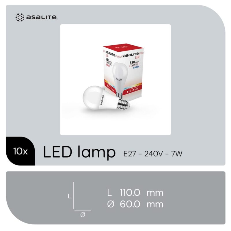 De Asalite LED Lamp A60 met E27 fitting is een energiezuinige lichtbron die geschikt is voor diverse ruimtes zoals de woonkamer, slaapkamer, horeca en kantoor. Deze bolvormige LED gloeilamp biedt een helder koud wit daglicht van 6500K, wat ideaal is voor ruimtes waar goede verlichting gewenst is. Met een vermogen van 7W, dat vergelijkbaar is met een traditionele 45W gloeilamp, levert deze lamp een lichtopbrengst van 630 lumen.