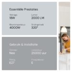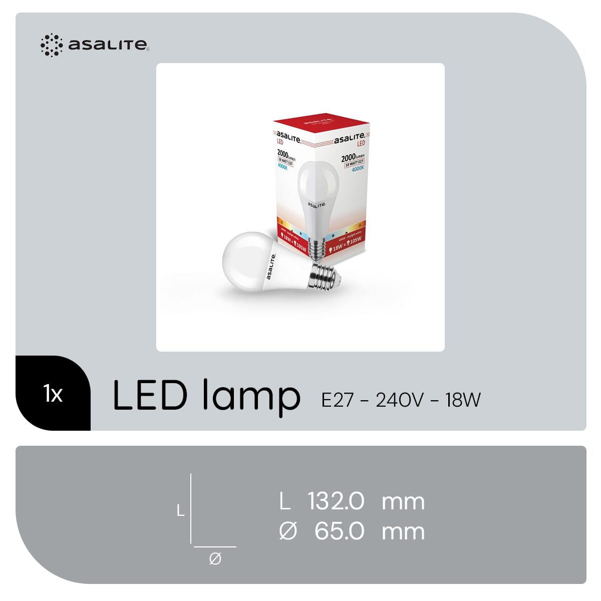 Met een vermogen van 18W, dat gelijkstaat aan 125W van een traditionele gloeilamp, biedt de Asalite LED lamp een efficiënte lichtopbrengst van 2000 lumen. Dit maakt de lamp niet alleen energiezuinig, maar ook kosteneffectief op de lange termijn.