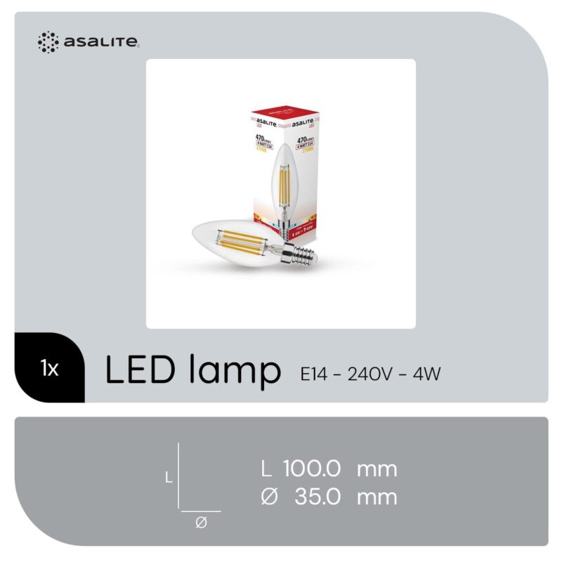 De Asalite LED Lamp C35 met E14 fitting is een energiezuinige lichtbron die geschikt is voor diverse toepassingen zoals kroonluchters, sfeerverlichting en hotelkamers. Deze lamp biedt een warm wit licht van 2700K en heeft een vermogen van 4W, wat vergelijkbaar is met een traditionele 35W gloeilamp. De lamp is niet dimbaar en heeft een retro look, wat bijdraagt aan een klassieke uitstraling in elke ruimte.