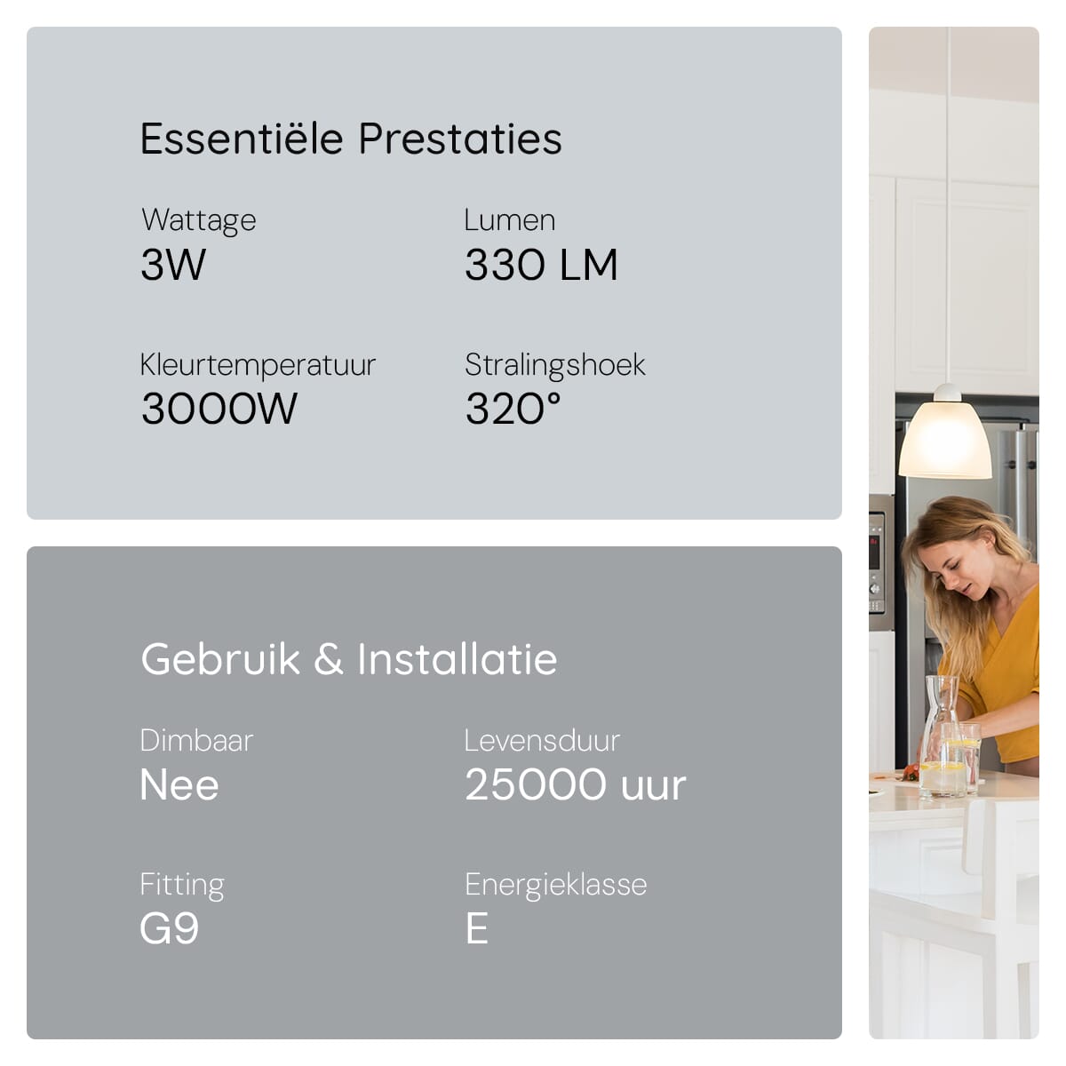 - Kleurtemperatuur: 3000K warm wit