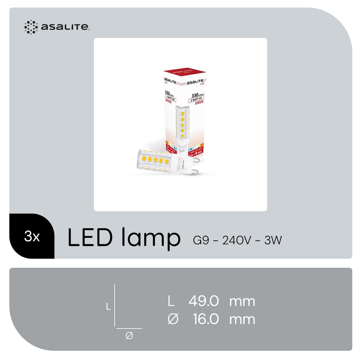 De Asalite LED Lamp met G9 fitting is een energiezuinige verlichtingsoplossing die geschikt is voor diverse toepassingen zoals wandlampen, plafondspots en meubelverlichting. Deze lamp biedt een helderheid van 330 lumen en straalt een warm wit licht van 3000K uit, wat zorgt voor een aangename sfeer in elke ruimte. De lamp is niet dimbaar en werkt op een spanning van 220-240V.