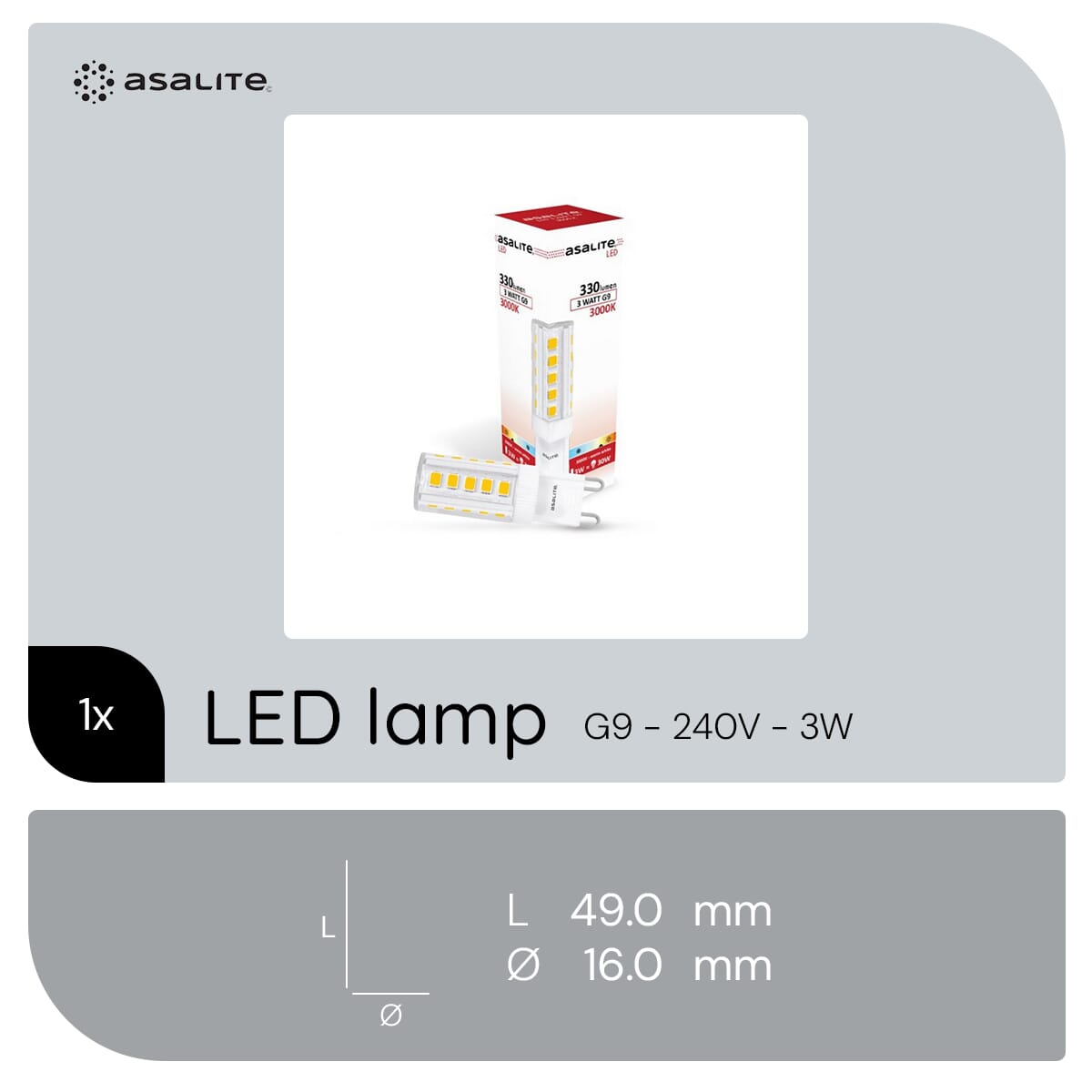 De Asalite LED Lamp met G9 fitting is een energiezuinige lichtbron die geschikt is voor diverse toepassingen zoals wandlampen, plafondspots en meubelverlichting. Met een vermogen van 3W, dat vergelijkbaar is met een traditionele 30W lamp, biedt deze LED lamp een efficiënte verlichting met een warm wit licht van 3000K. De lamp is niet dimbaar en werkt op een spanning van 220-240V.