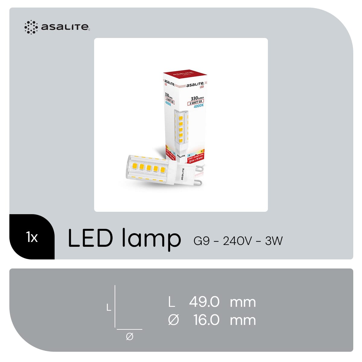 De Asalite LED Lamp met G9 fitting is een energiezuinige lichtbron die geschikt is voor diverse toepassingen zoals wandlampen, plafondspots en meubelverlichting. Met een vermogen van 3W, dat vergelijkbaar is met een traditionele 30W lamp, biedt deze LED lamp een efficiënte verlichting met een helderheid van 330 lumen. Het neutraal witte licht van 4000K zorgt voor een natuurlijke en aangename sfeer in elke ruimte.