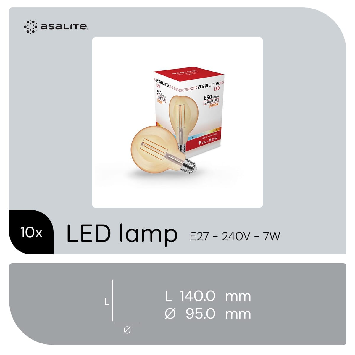 De Asalite LED Lamp G95 met E27 fitting is een energiezuinige verlichtingsoplossing die geschikt is voor diverse interieurstijlen, zoals hotels, bars en vintage interieurs. Deze lamp biedt een warm wit licht van 2000K en is ontworpen om een traditionele 50W gloeilamp te vervangen met slechts 7W energieverbruik. De lamp wordt geleverd in een set van 10 stuks, ideaal voor grotere ruimtes.