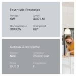 - Kleurtemperatuur: 3000K warm wit