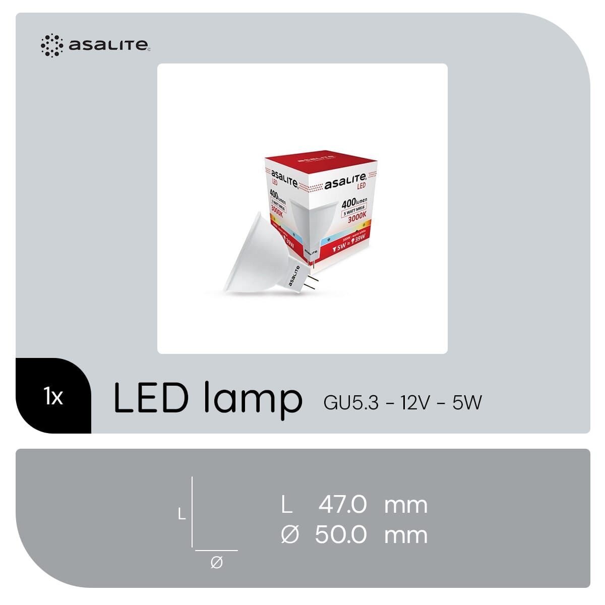 De Asalite LED Lamp MR16 GU5.3 is een energiezuinige lichtbron die geschikt is voor diverse toepassingen zoals inbouwspots, campers en bootverlichting. Deze LED lamp biedt een warm wit licht van 3000K en heeft een lichtopbrengst van 400 lumen. Met een vermogen van 5W vervangt deze lamp een traditionele 39W halogeenlamp, wat resulteert in een aanzienlijke energiebesparing.