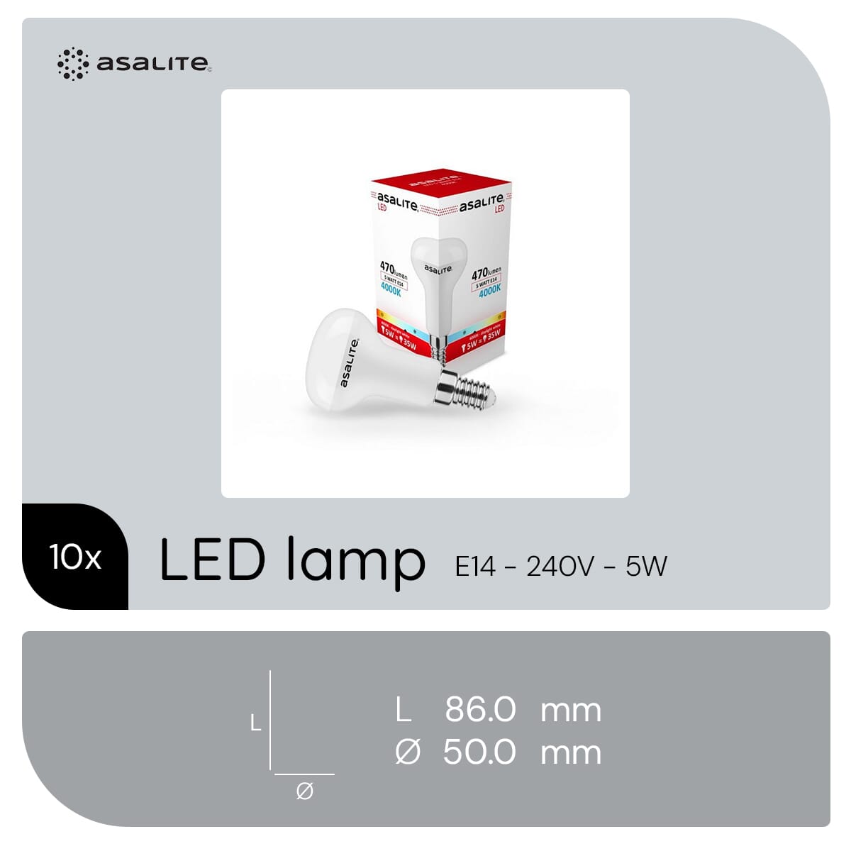 De Asalite LED Lamp R50 met E14 fitting is een energiezuinige lichtbron die geschikt is voor diverse toepassingen zoals wandspots en plafondarmaturen. Deze lamp biedt een helder neutraal wit licht van 4000K, wat ideaal is voor ruimtes waar goed zicht belangrijk is. Met een vermogen van 5W, dat vergelijkbaar is met een traditionele 37W lamp, biedt deze LED lamp een efficiënte verlichting voor kleine fittingen.