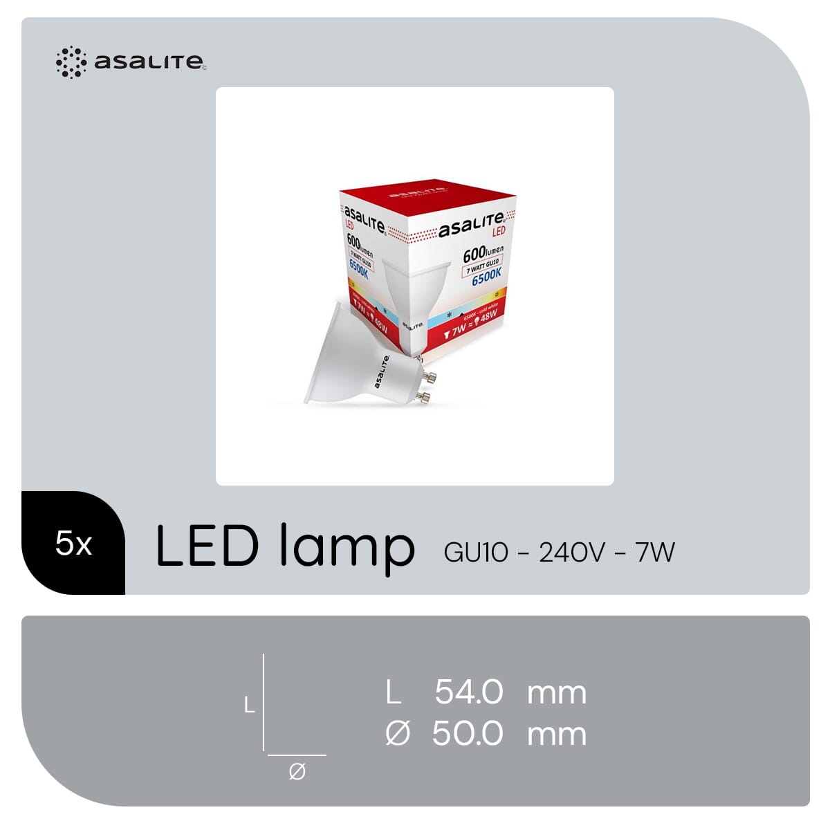 De Asalite LED Lamp Spot met GU10 fitting is een energiezuinige verlichtingsoplossing die geschikt is voor diverse toepassingen zoals inbouwspots, plafondverlichting, keukens en winkels. Deze LED spotlamp biedt een helder koud wit daglicht van 6500K, wat ideaal is voor ruimtes waar goede verlichting essentieel is. Met een vermogen van 7W, dat gelijkstaat aan een traditionele 50W lamp, levert deze lamp een lichtopbrengst van 600 lumen.