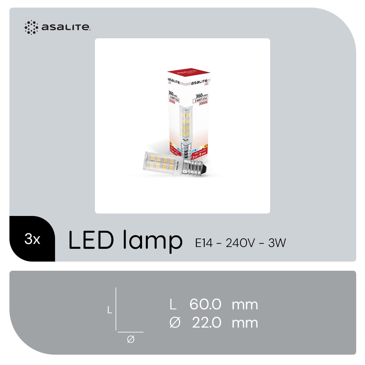 De Asalite LED Lamp Staaf met E14 fitting is een energiezuinige lichtbron die ideaal is voor gebruik in nachtlampen, koelkasten en smalle armaturen. Met een vermogen van 3W, dat gelijkstaat aan een traditionele 30W gloeilamp, biedt deze lamp een efficiënte verlichting met een warm wit licht van 3000K. De lamp is niet dimbaar en werkt op een spanning van 220-240V.
