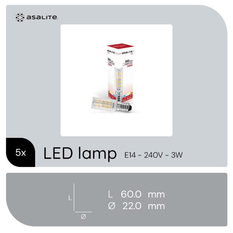 De Asalite LED Lamp Staaf met E14 fitting is een energiezuinige lichtbron die geschikt is voor diverse toepassingen zoals nachtlampen, koelkasten en smalle armaturen. Deze LED lamp biedt een warm wit licht van 3000K en heeft een lichtopbrengst van 360 lumen, wat vergelijkbaar is met een traditionele 30W gloeilamp. De lamp is niet dimbaar en werkt op een spanning van 220-240V.