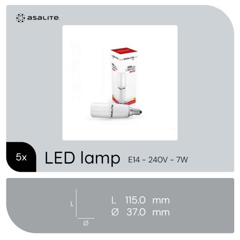 De Asalite LED Lamp T37 met E14 fitting is een energiezuinige lichtbron die geschikt is voor diverse toepassingen in huis. Deze lamp vervangt een traditionele 47W gloeilamp en biedt een helderheid van 600 lumen. Met een kleurtemperatuur van 3000K levert de lamp warm wit licht, ideaal voor een gezellige sfeer in woonruimtes zoals badkamers, wandlampen en nachtlampjes. De lamp is niet dimbaar en werkt op een spanning van 220-240V.