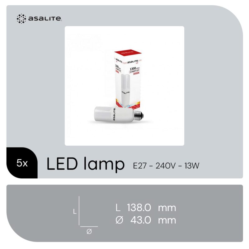 De Asalite LED Lamp T45 met E27 fitting is een energiezuinige verlichtingsoplossing die geschikt is voor diverse toepassingen, zoals wandlampen, badkamers en smalle armaturen. Deze LED staaflamp biedt een helderheid van 1300 lumen en straalt een warm wit licht van 3000K uit, wat zorgt voor een aangename sfeer in elke ruimte. De lamp is niet dimbaar en werkt op een spanning van 220-240V.