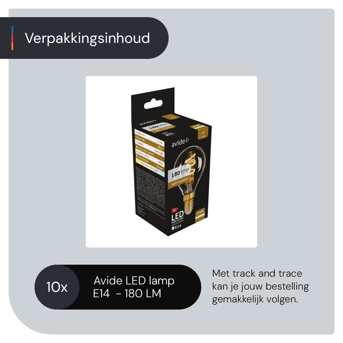 - Hoeveel lampen zitten er in een verpakking? Elke verpakking bevat 10 stuks van de Avide E14 LED Filament Lamp.
