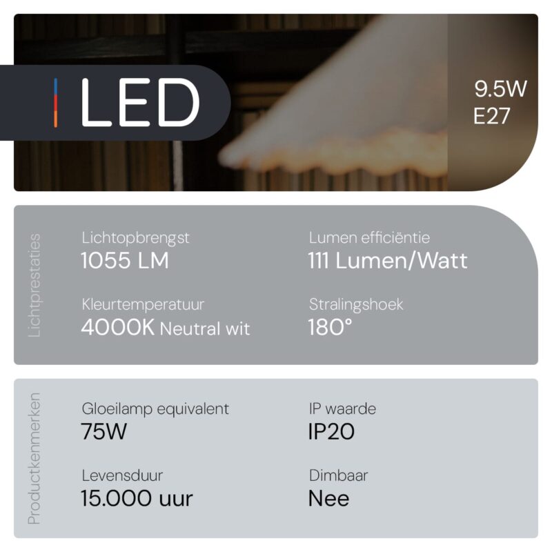 - Energiezuinig: Met slechts 9.5W verbruik bespaar je aanzienlijk op je energierekening zonder in te boeten op helderheid.