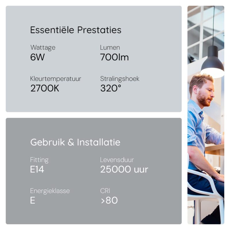 De E14 fitting maakt deze lamp compatibel met een breed scala aan armaturen, waardoor het een veelzijdige keuze is voor verschillende toepassingen. De lamp werkt op 230V, wat standaard is in de meeste huishoudens.