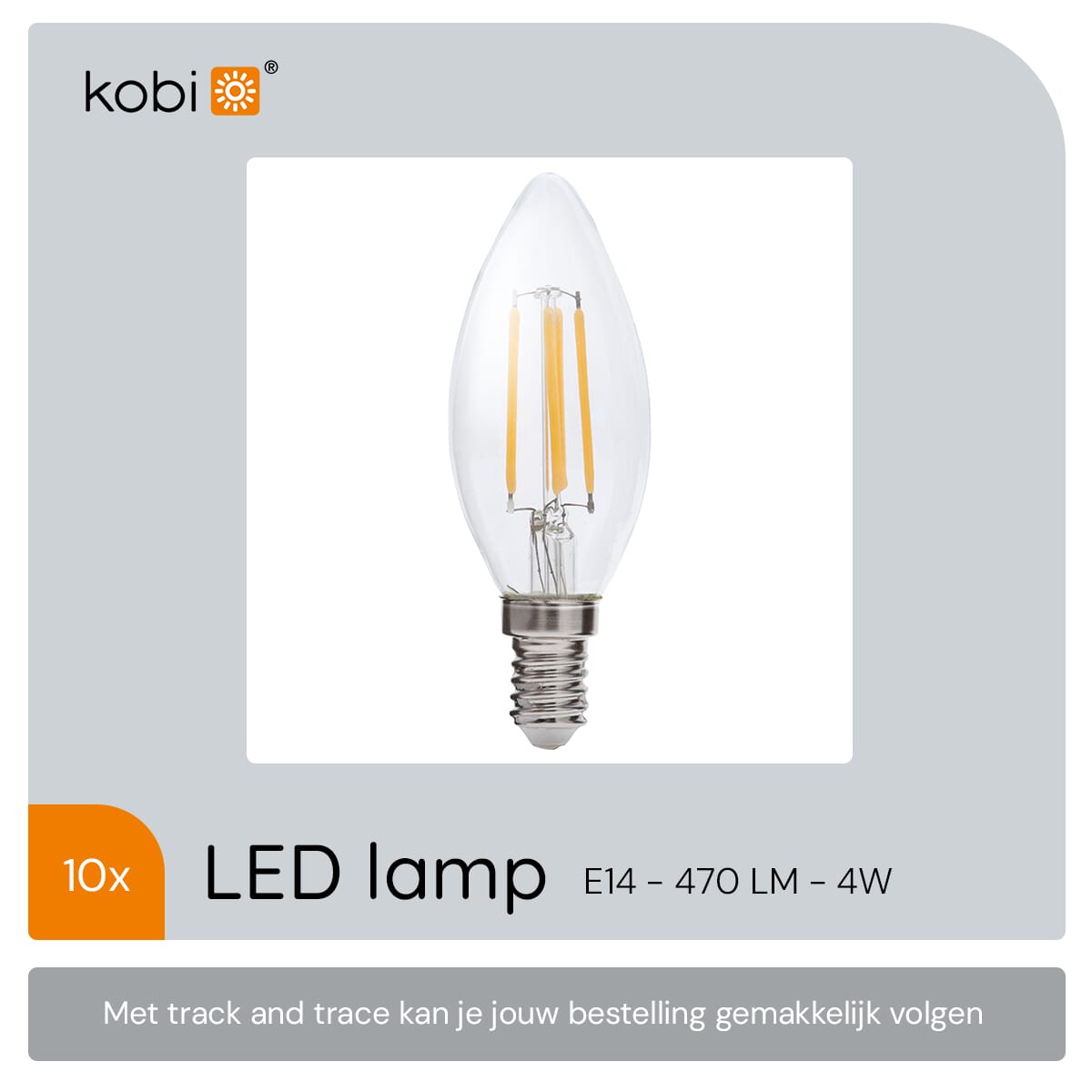 De Kobi LED Filamentlamp E14 4W is een energiezuinige lichtbron die ideaal is voor sfeerverlichting in lampenkappen of nissen. Met een vermogen van 4 watt en een lichtopbrengst van 470 lumen, biedt deze lamp een warm wit licht van 3000K. De lamp heeft een kleine bolvorm en een stralingshoek van 360 graden, waardoor het licht gelijkmatig wordt verspreid. Deze set bevat 10 stuks, geschikt voor gebruik op 230V.