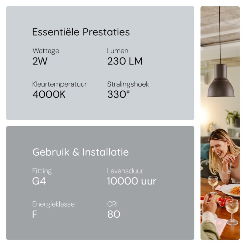 Dankzij het compacte formaat en de G4 fitting is deze LED lamp eenvoudig te installeren in diverse armaturen. Het is geschikt voor gebruik in kleine ruimtes zoals badkamerkasten, waar ruimte beperkt is.