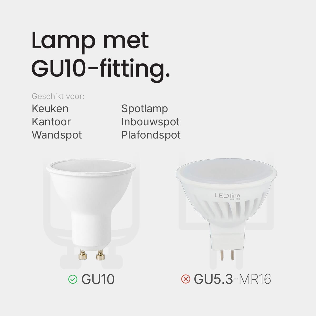 De spot is ontworpen voor gebruik met standaard GU10 fittingen, wat installatie eenvoudig maakt zonder dat er aanpassingen nodig zijn aan bestaande armaturen.