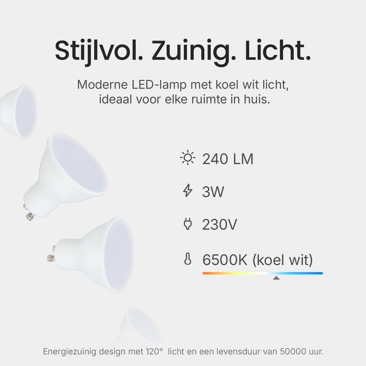 Met een lichtopbrengst van 240 lumen biedt deze LED spot helder en consistent licht, ideaal voor het verlichten van woonruimtes, keukens of werkplekken. De lichtkwaliteit blijft stabiel gedurende de levensduur van de lamp.
