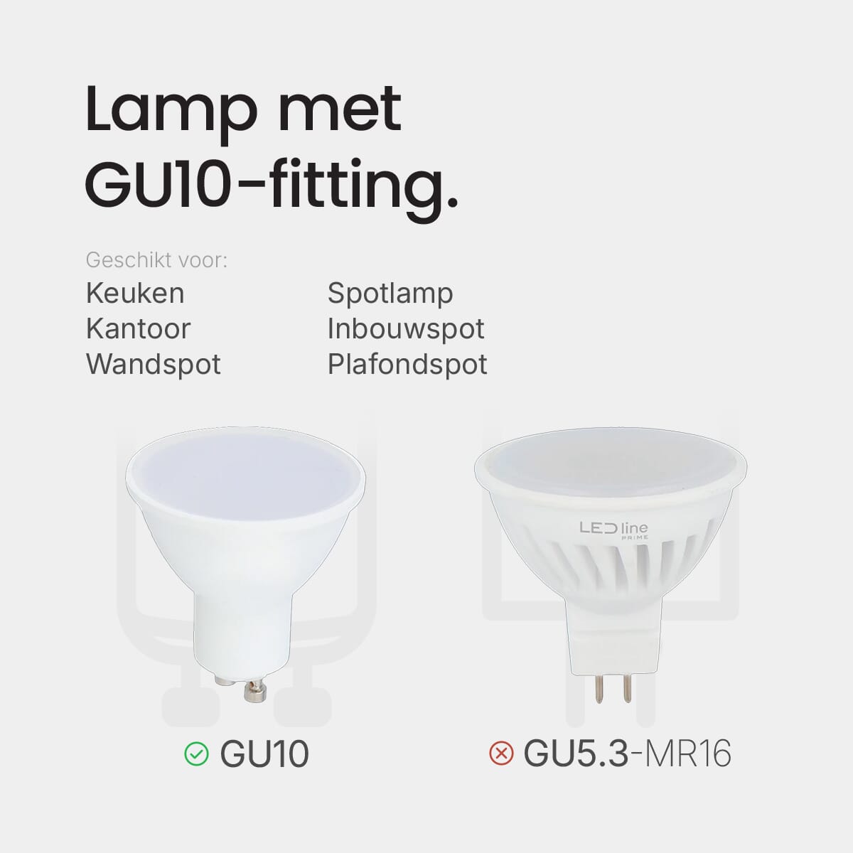 De spot is ontworpen voor gebruik met standaard GU10 fittingen, wat installatie eenvoudig maakt zonder dat er aanpassingen nodig zijn aan bestaande armaturen.