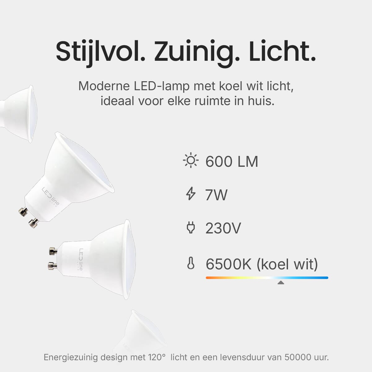 De LED line LED Spot GU10 is ontworpen met energie-efficiëntie in gedachten. Met een verbruik van slechts 7W bespaart deze spot aanzienlijk op energiekosten in vergelijking met traditionele 40W halogeenlampen.