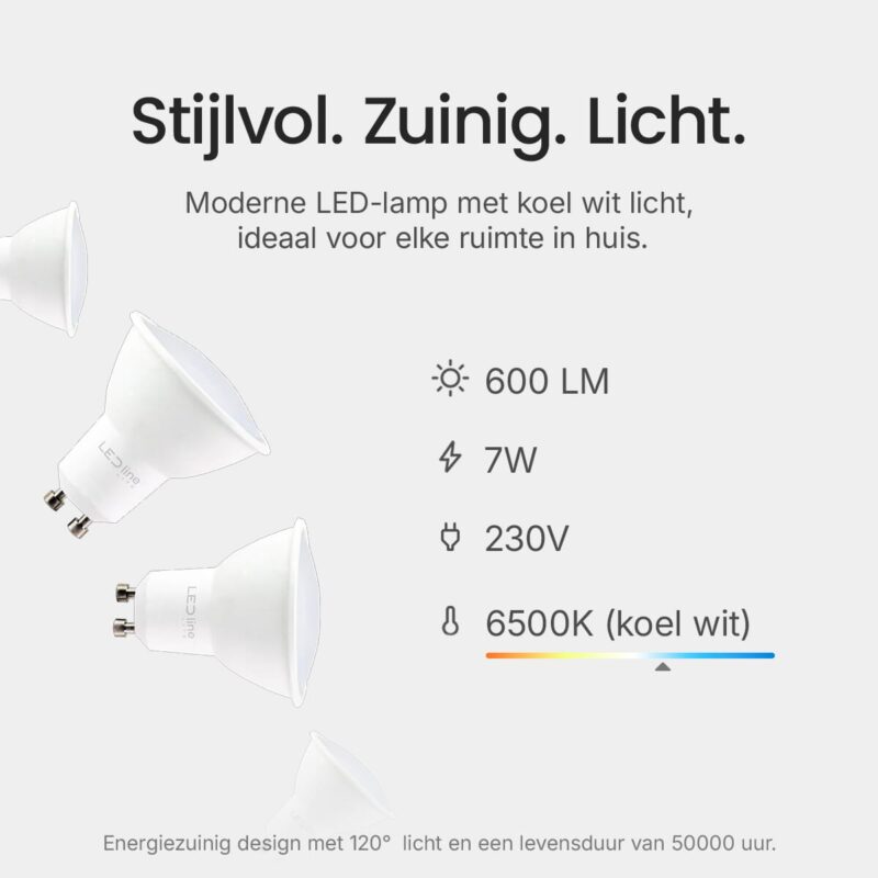 De LED line LED Spot GU10 verbruikt slechts 7W, wat aanzienlijk minder is dan de traditionele 40W halogeenlampen. Dit maakt het een kosteneffectieve keuze voor wie zijn energierekening wil verlagen zonder in te boeten op lichtkwaliteit.