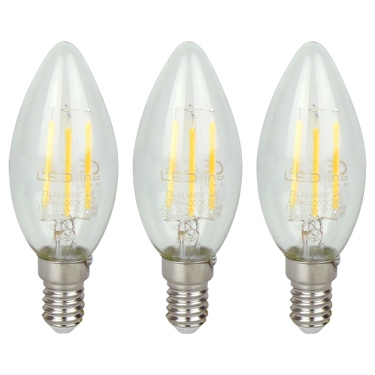 De LED line LITE LED Filament Kaarslamp C35 E14 is een energiezuinige lichtbron die ontworpen is om traditionele 40W gloeilampen te vervangen. Met een vermogen van slechts 4W biedt deze lamp een lichtopbrengst van 480 lumen. De lamp heeft een diameter van 35mm en werkt op een standaard spanning van 230V. Deze set bevat drie stuks, ideaal voor gebruik in kroonluchters, wandlampen en andere armaturen met een E14 fitting.