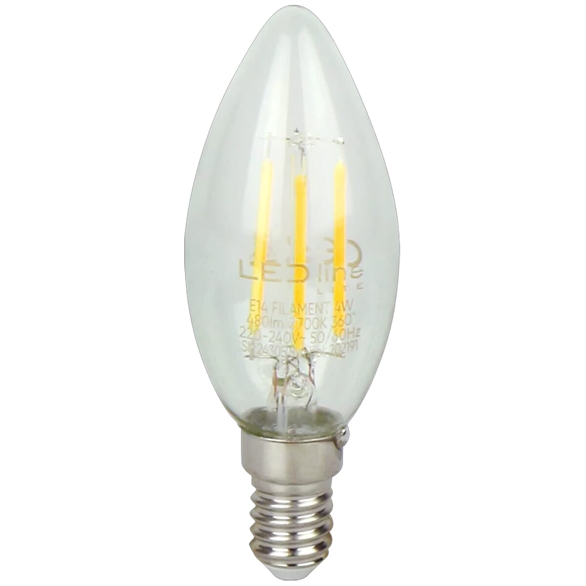 De LED line LITE LED Filament Kaarslamp C35 E14 is een energiezuinige lichtbron die ontworpen is om traditionele 40W gloeilampen te vervangen. Met een vermogen van slechts 4W biedt deze lamp een lichtopbrengst van 480 lumen, wat zorgt voor een heldere en efficiënte verlichting. De lamp heeft een diameter van 35mm en werkt op een standaard 230V netspanning, waardoor hij geschikt is voor diverse toepassingen in huis.