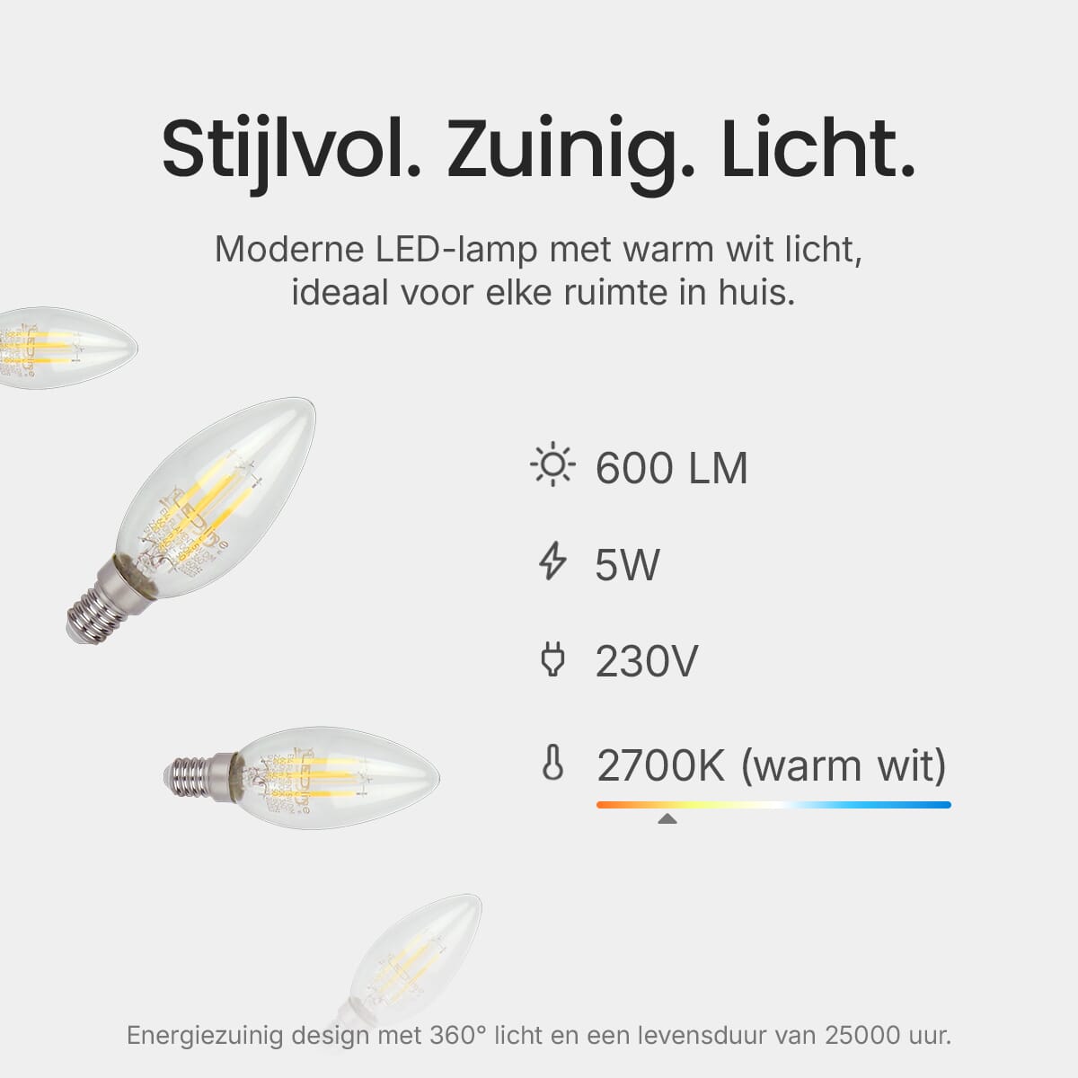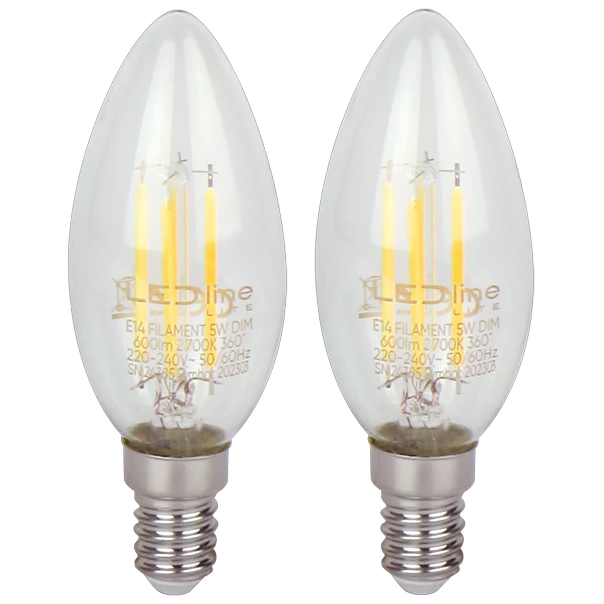De LED line LITE LED Filament Kaarslamp C35 E14 is een energiezuinige lichtbron die traditionele gloeilampen van 50W vervangt. Met een vermogen van slechts 5W biedt deze lamp een lichtopbrengst van 600 lumen. De lamp heeft een diameter van 35 mm en werkt op een spanning van 230V. Deze kaarslamp is dimbaar, waardoor je de lichtintensiteit naar wens kunt aanpassen. De verpakking bevat twee stuks, ideaal voor gebruik in kroonluchters, wandlampen of andere armaturen met een E14 fitting.